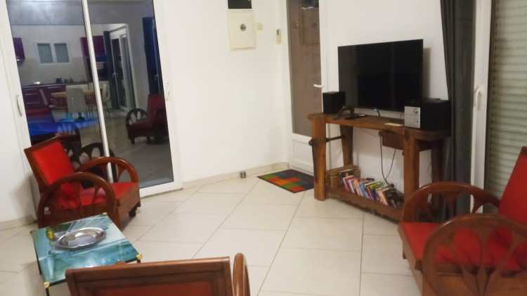 Le séjour a de grandes baies vitrées qui donnent sur le jardin. Il comprend un canapé en cuir , trois fauteuils, une table basse, une télévision à écran plat (Smart TV 108 cm) et une mini chaîne Hi-Fi.